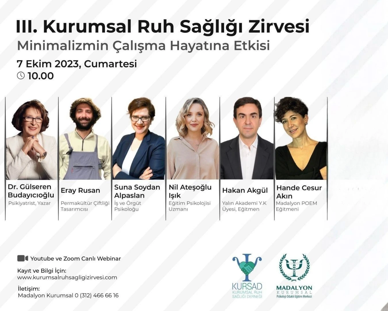 Türkiye’nin ilk Kurumsal Ruh Sağlığı Zirvesinin üçüncüsünü sizlere duyurmanın heyecanı içerisindeyiz. Bu yıl üçüncüsünü düzenlediğimiz zirvenin ana teması; MİNİMALİZMİN ÇALIŞMA HAYATINA ETKİSİ 10 Ekim Dünya Ruh Sağlığı gününü de içeren zirvemiz Madalyon Kurumsal Psikoloji Odaklı Eğitim Merkezi ev sahipliğinde hazırlandı. Program boyunca, sektöre emek veren eğitimci, psikolog, psikiyatrist, tasarımcı gibi