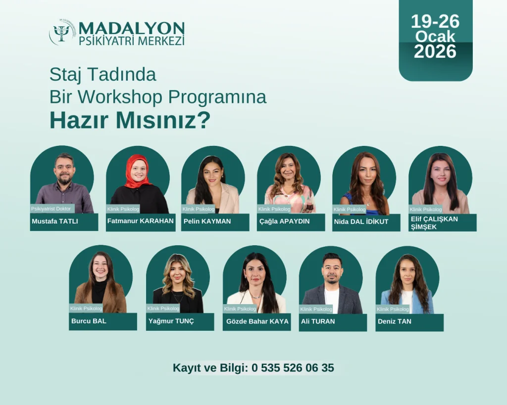 Staj tadında bir workshop programına hazır mısınız?19-26 Ocak tarihlerinde birbirinden değerli uzmanlarla gerçekleştirilecek workshop, mesleki kariyerinize önemli bir katkı sağlayacak! Workshop, üniversitelerin Psikolojik Danışmanlık ve Rehberlik ile Psikoloji bölümlerinin 3. ve 4. Sınıf öğrencileri ile Klinik Psikoloji Yüksek Lisans öğrencilerine yönelik düzenlenmektedir. Kaydolmak ve Bilgi Almak İçin: 0535 526 06